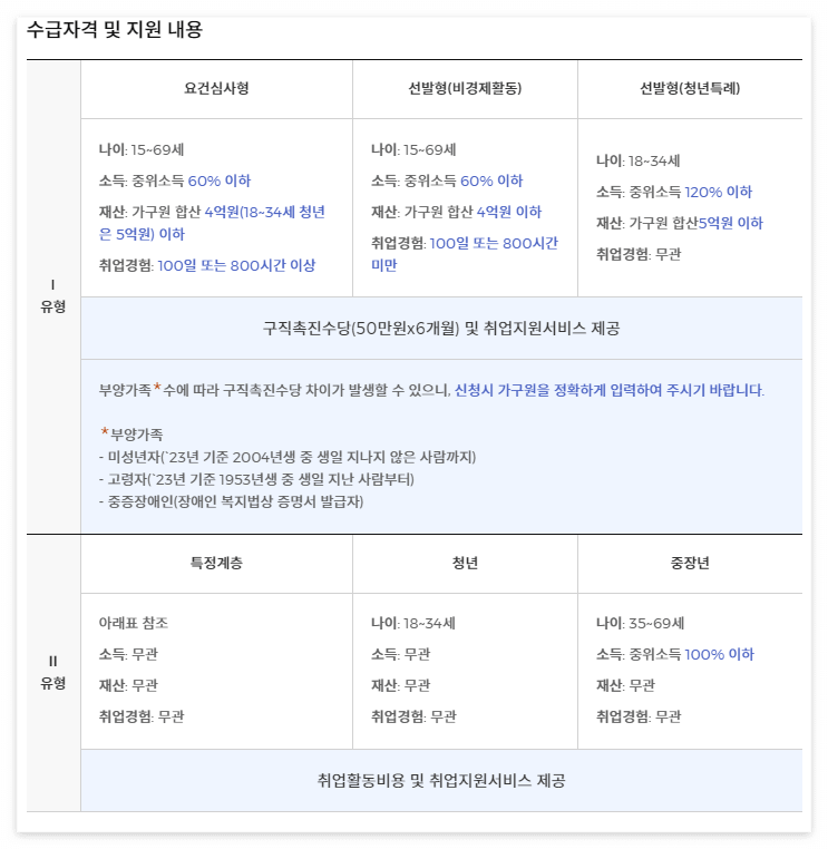 : 가구단위 중위소득 *60% 이하이고 재산 4억원(18~34세 청년은 5억) 이하이면서, 최근 2년안에 100일 또는 800시간 이상의 취업경험이 있는 사람을 중심으로 합니다.