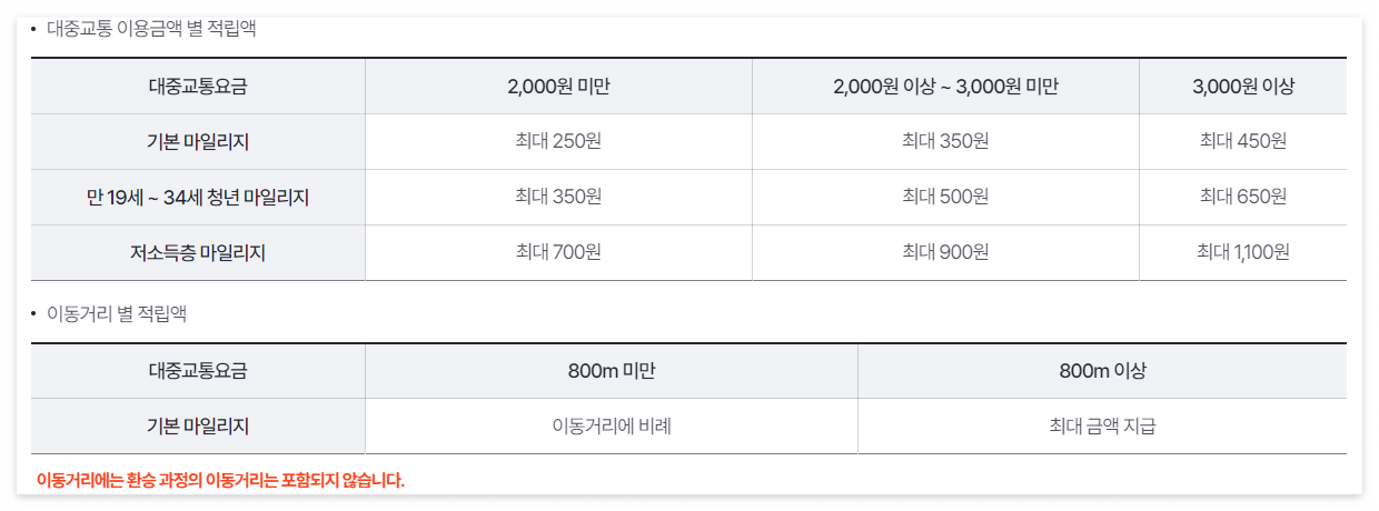 : 대중교통 1회 이용 시 이동거리 최대 800m까지 인정, 월 15회 미만 이용 시 적립액은 소멸됩니다.