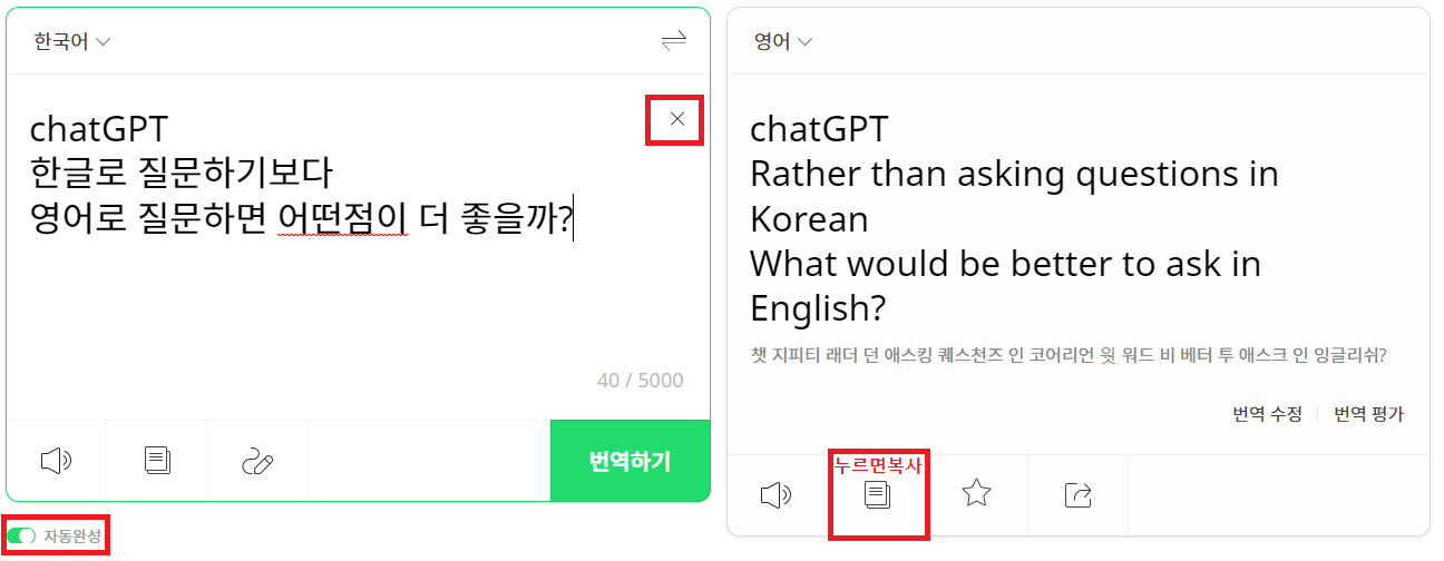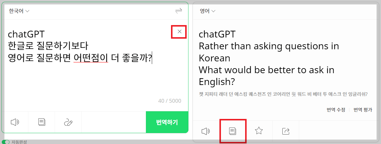 - 한국어 박스에 질문하고 싶은 내용을 한글로 작성합니다.